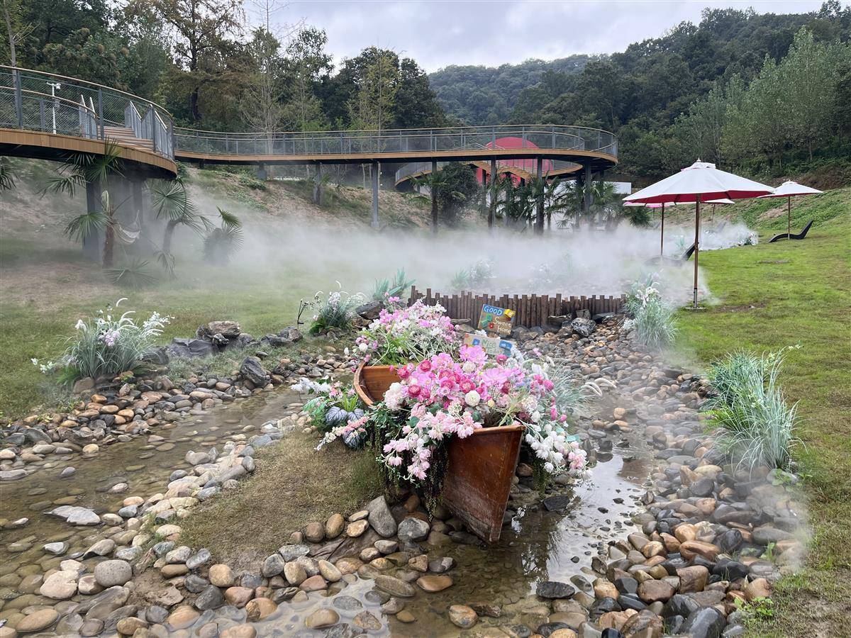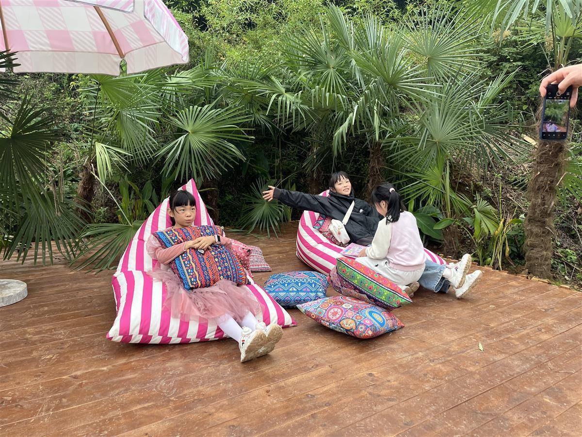 不远处,李女士正在为女儿举办生日会。吃完蛋糕,一家人在山谷里漫步,户外雾森景观让人仿佛置身于世外桃源。路过心仪的打卡点时,他们拿出手机定格下温馨快乐的瞬间。